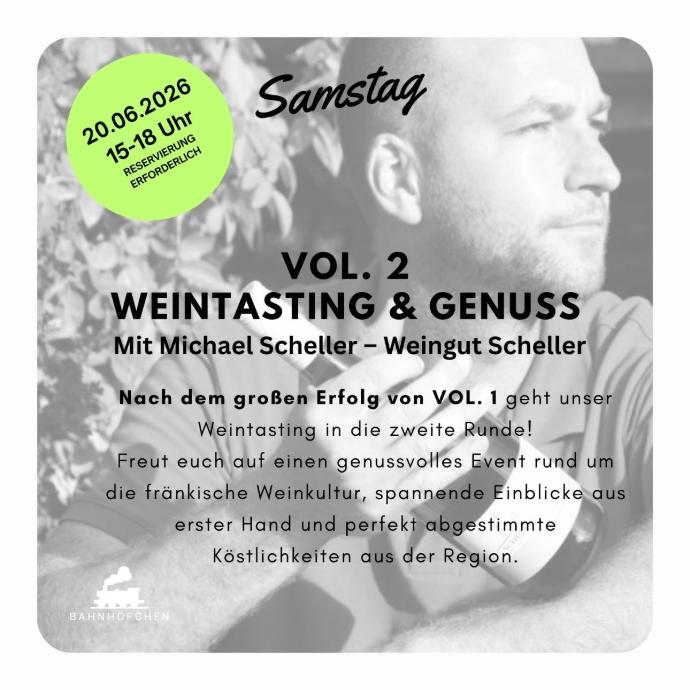 Im Juni starten wir mit einem besonderen Wein-Highlight in die Saison! Am 20. Juni 2026 heißt es „VOL. 2 – Weintasting & Genuss“: Freu dich auf vier ausgewählte Weine, spannende Einblicke aus erster Hand und perfekt abgestimmte Köstlichkeiten aus der Region. Winzer Michael Scheller begleitet dich durch den Nachmittag und nimmt dich mit auf eine Reise durch die Vielfalt fränkischer Weine.